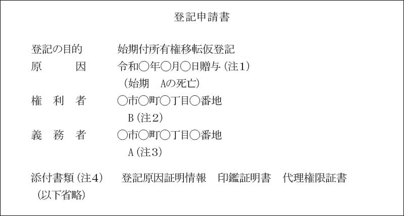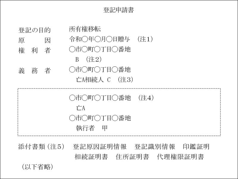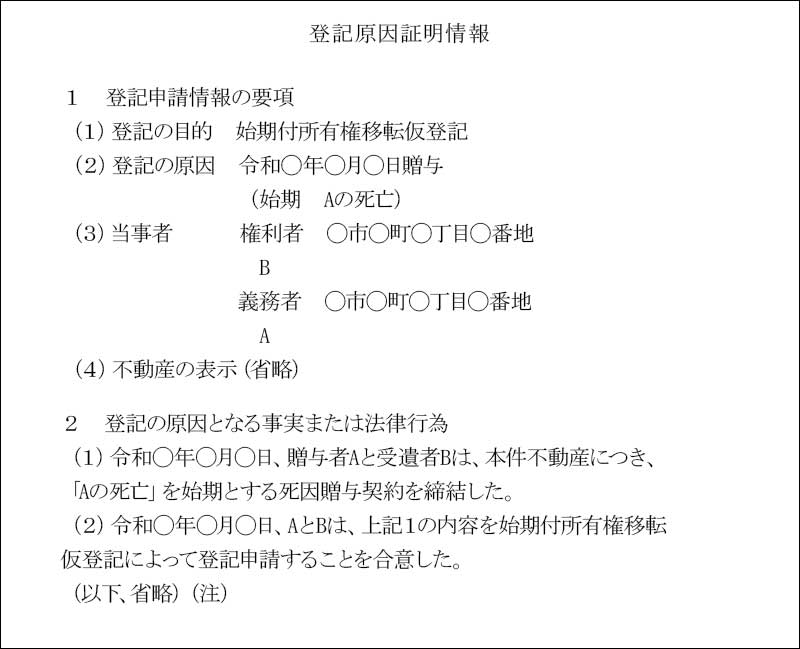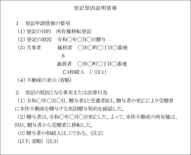 (注4)①登記原因証明情報(不動産登記法61条、不動産登記令7条1項5号ロ) 死因贈与契約書が、当事者、不動産の表示等が記載されて登記原因証明情報として の要件を備えているときは、これを登記原因証明情報とすることができる。